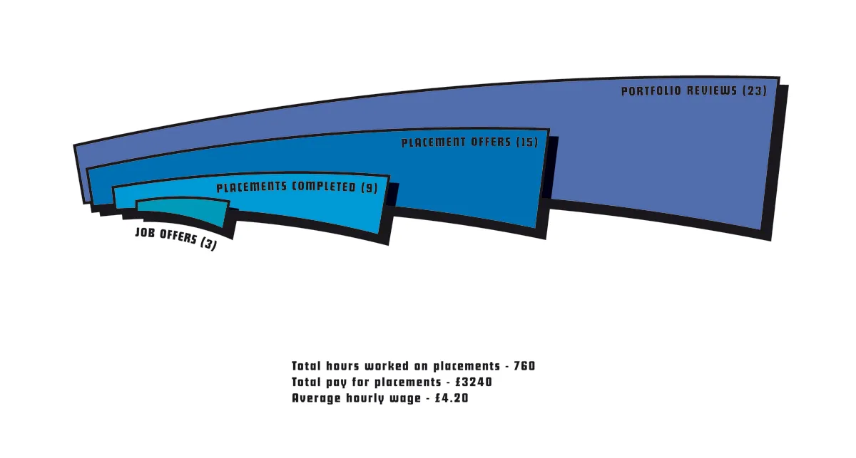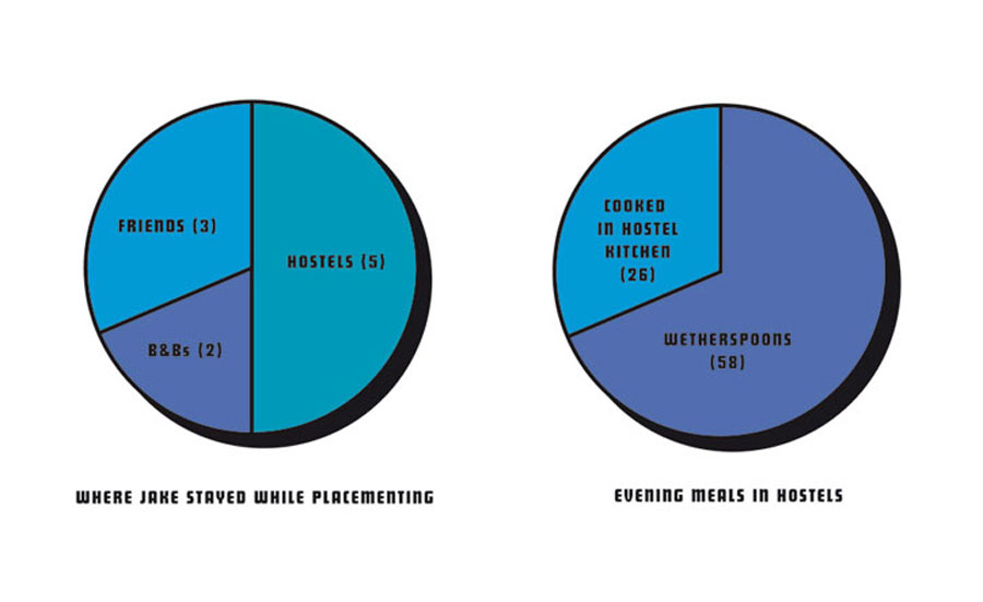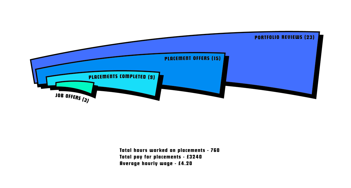 If a studio does offer you a placement but can’t offer payment, don’t necessarily turn it down – one of Jake’s favourite placements, Navyblue Edinburgh, were honest and after a difficult financial year said they couldn’t pay him but instead offered him the chance to work on a variety of live briefs which led to his work being shown to the client. However, beware of studios taking the piss, because some will (one studio had interns booked solidly for the six months after Jake, begging the question ‘Is this just free labour?’)